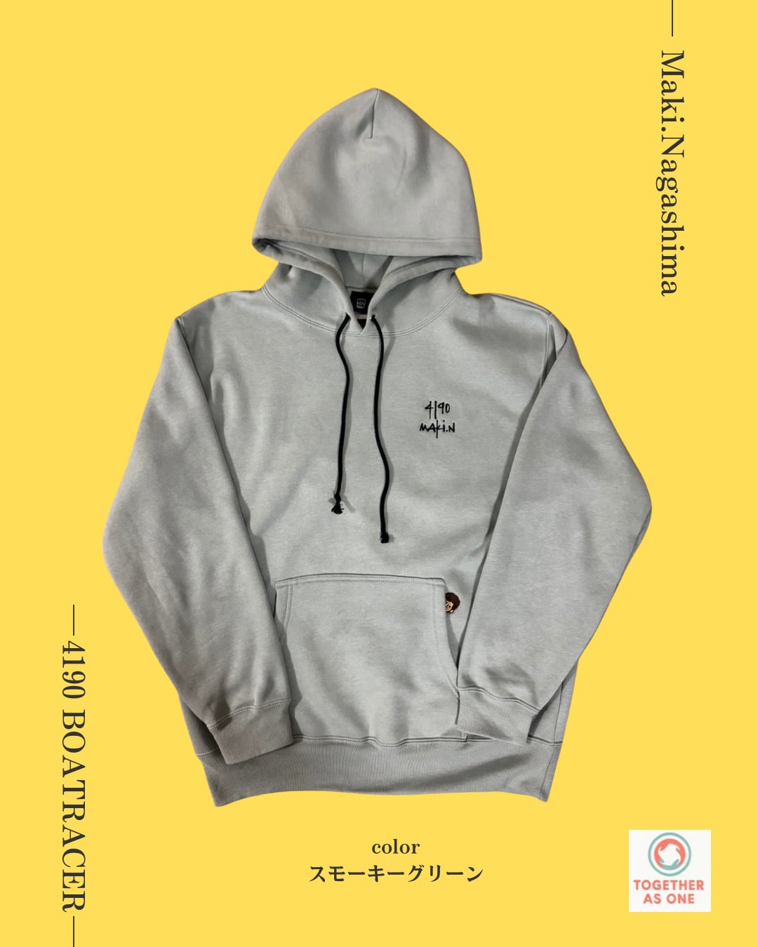 パーカーポケットから、ひょっこりのMAKIキャラロゴ がポイントの、ユニセックスパーカー。