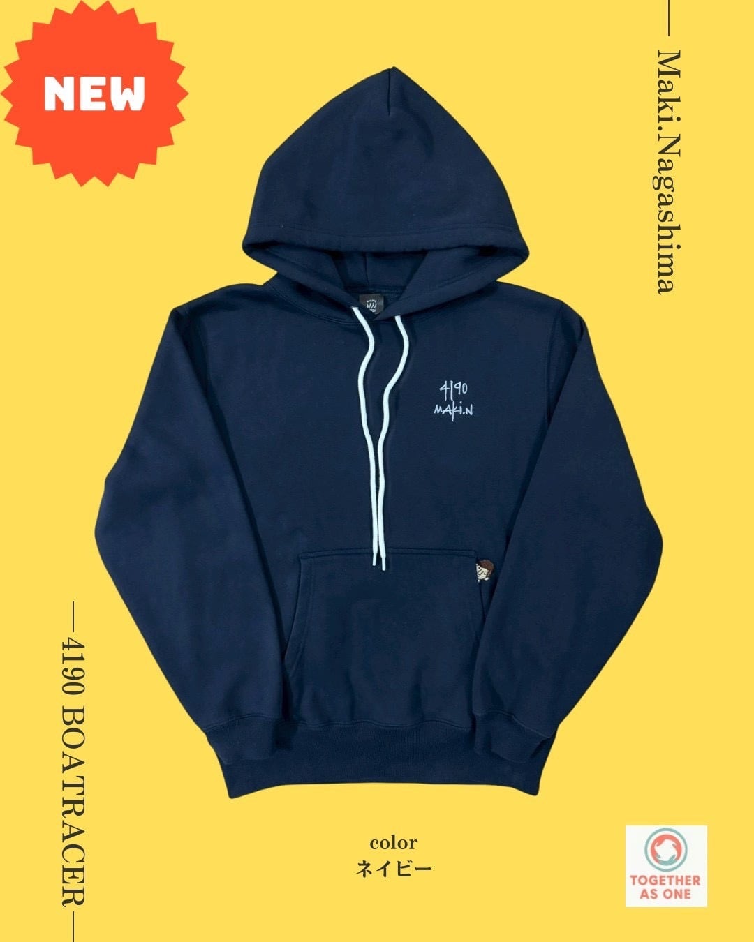 パーカーポケットから、ひょっこりのMAKIキャラロゴ がポイントの、ユニセックスパーカー。